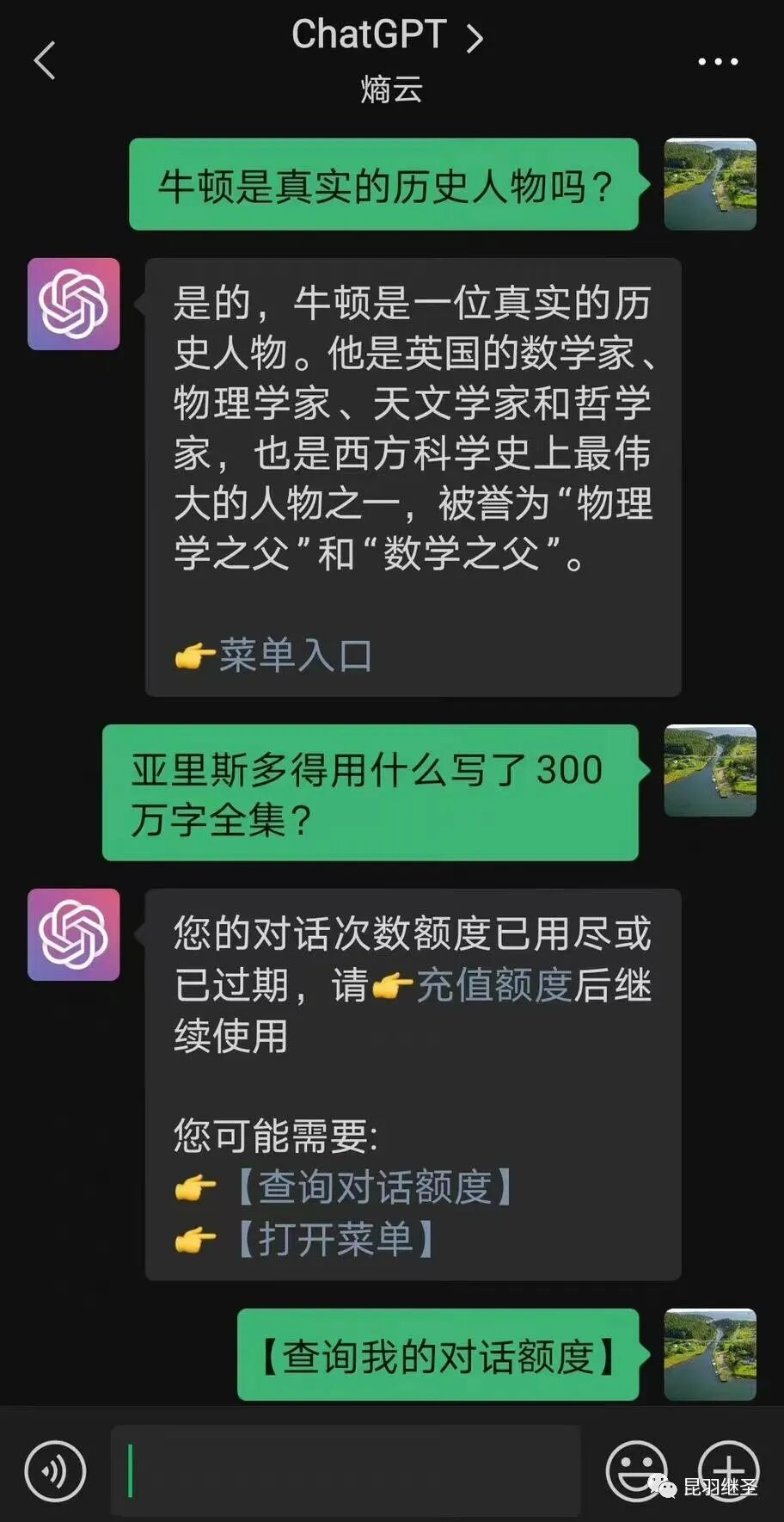 很可惜,第五个问题尚未来得及回答,便友情提示:您的对话次数额度已用尽或已过期。请充值额度后继续使用……