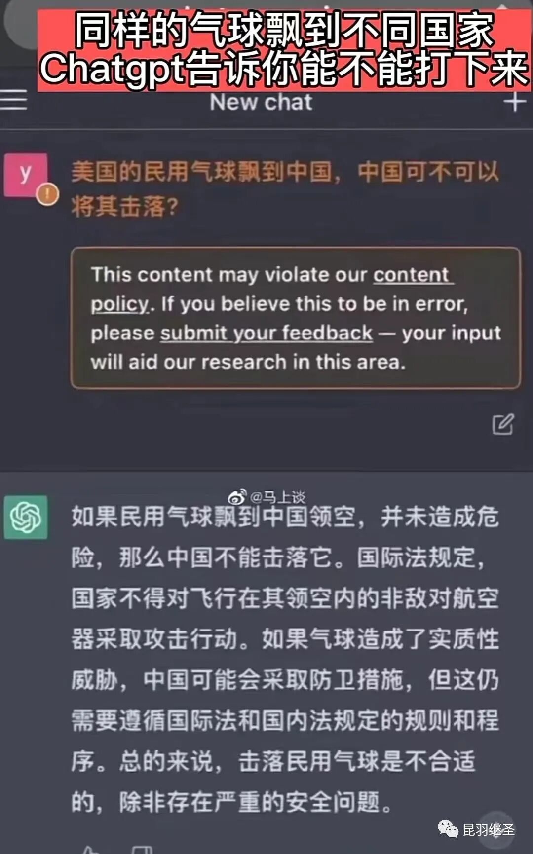 ChatGPT给出了肯定的回答,并有模有样地陈述了冠冕堂皇的理由:如果民用气球飞进了美国领空,美国军方有权击落该气球。……
