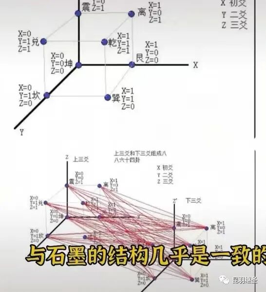 如果将六十四卦分布于三维的空间坐标系中,其构成的立体图形与石墨的结构几乎完全一致,揭示了生命的基本元素“碳”(最稳定的元素)与天象之间的密切关系。