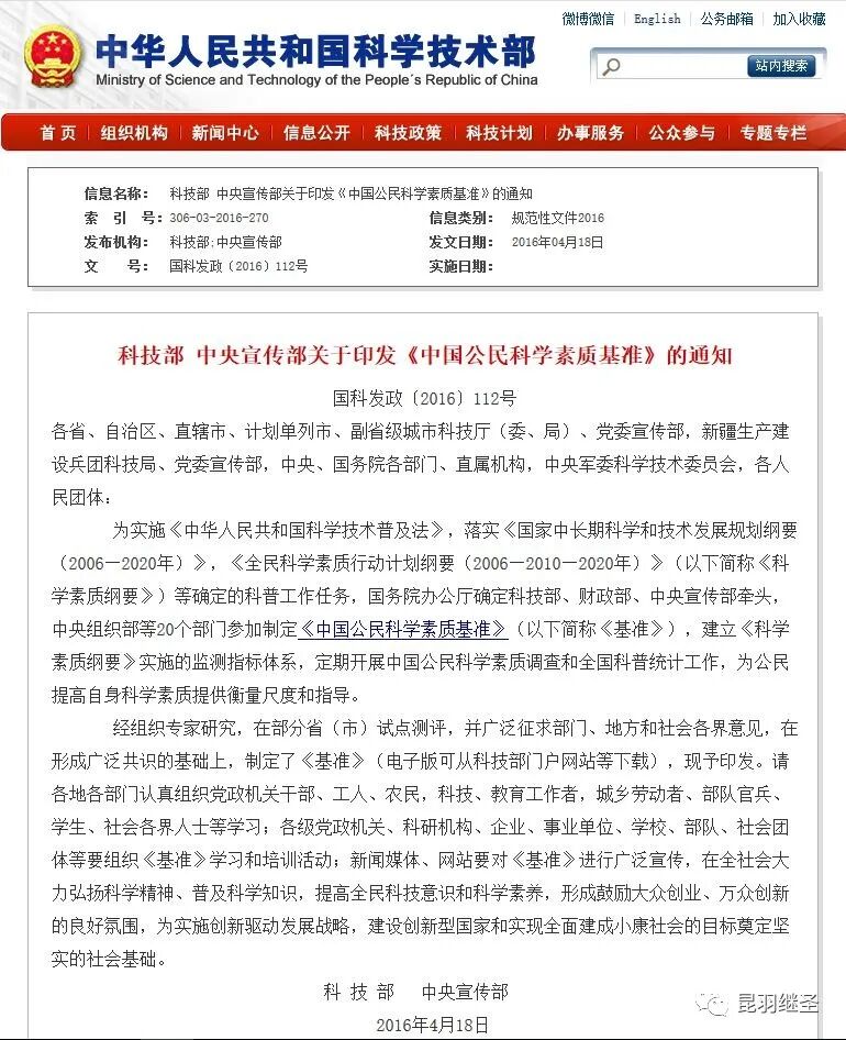2016年4月18日,科技部、中宣部曾发布了关于印发《中国公民科学素质基准》的通知(以下简称《通知》)和《中国公民科学素质基准》(以下简称《基准》),其中提到: