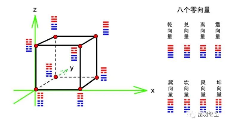八卦在一个立体上,对应六个面,有X、Y、Z三个维度,一个维度对应两个向量。通过组合分拆,在八卦系统模型内,穷尽组合,对应八个元素,也就是八个卦象。