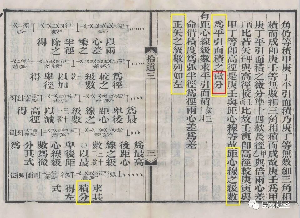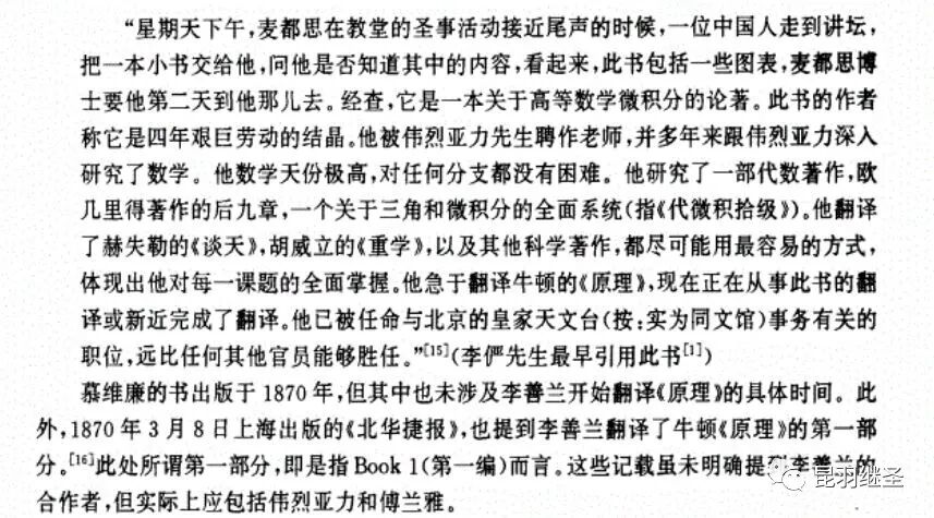 “微分积分为算学绝诣,凡借根、天元所不能推者,用此则无不可推,咸以为创自近代。窃按西历一千四十二年,当宋仁宗庆历三年,法国儒士始创微分积分,其由来固已久矣。奈端(牛顿)、欧楼等所造特因其术而推阐益精耳。””