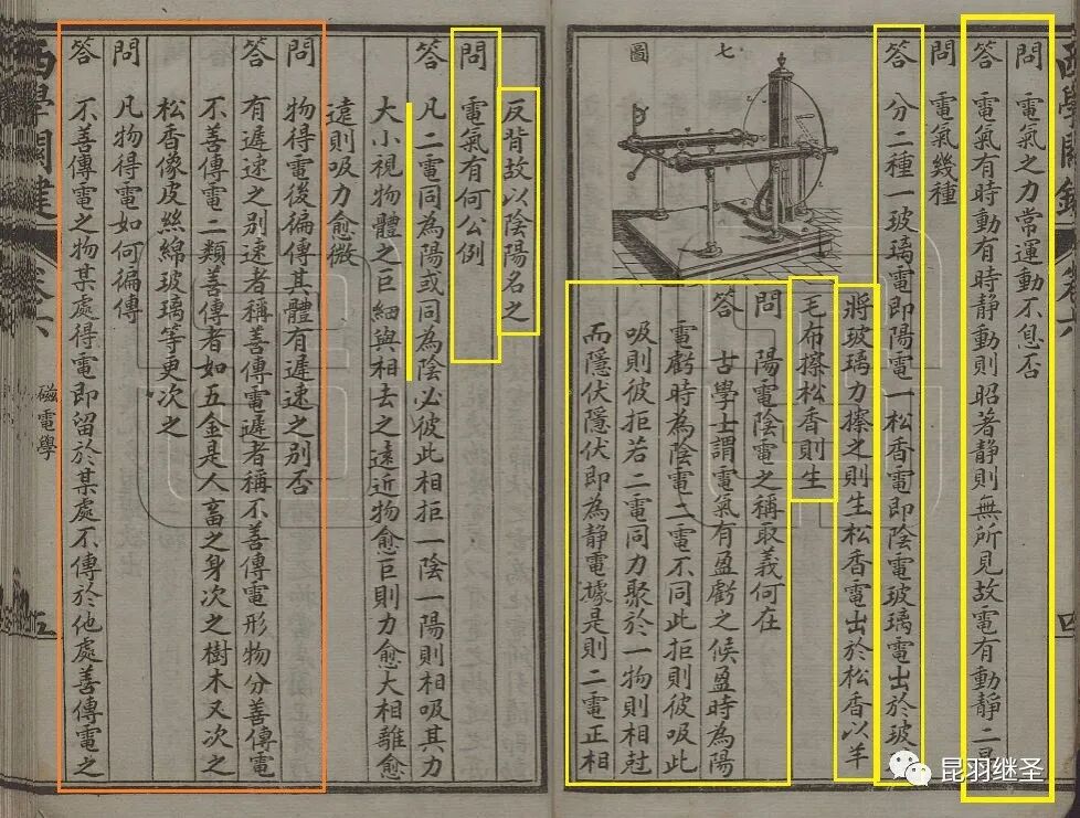 答:古学士谓电气有盈亏之候,盈时为阳电,亏时为阴电,二电不同,此拒则彼吸,此吸则彼拒(同性相斥,异性相吸)。若二电同力聚于一物则相克而隐伏,隐伏即为静电。据是,则二电相反背,故以阴电名之。