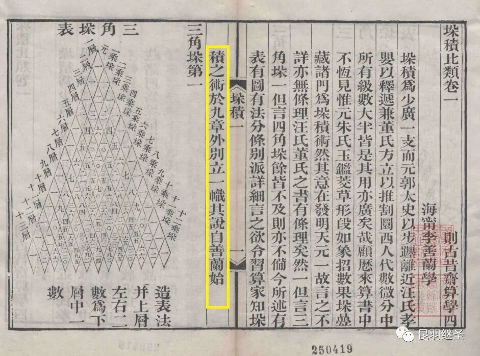 则古昔斋算学.十三种.清.李善兰.撰.清同治六年刊本,垛积比类卷一,垛积一,三角垛第一,如下图所示。