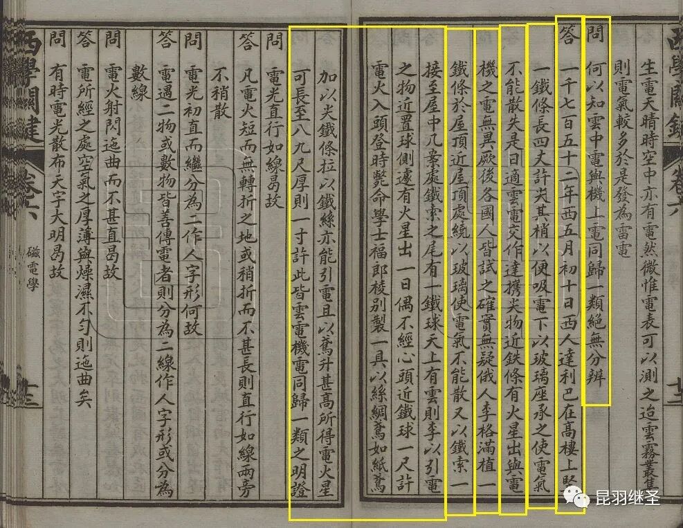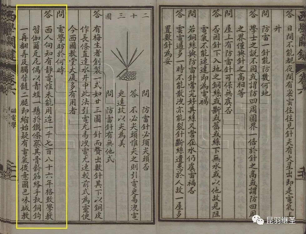 好巧,1903年的《西学关键》“卷六,磁电学,十三”也恰好记载了避雷针的故事。