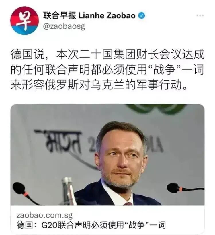 与此同时,二十国集团(G20)财长和央行行长会议于2月24日至25日在印度班加罗尔召开。德国坚持任何联合声明都必须使用“战争”一词来形容俄罗斯对乌克兰的特别军事行动。法国等国亦表示赞成。但作为东道主的印度却表示反对,认为用“危机”一词来描述更容易被接受。中国方面,也希望能在声明中删除“战争”一词,因为这只会火上浇油,并不利于事件的解决。由于多方之间存在巨大分歧,本次峰会成为有史以来第一次不发表联合声明的峰会。