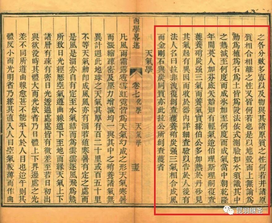 当中朝乾隆年间(1736-1796年在位),英人加芬底矢(卡文迪许)始知有轻气(氢气)迨伯理斯理嗣复查获养硝炭强三气,而养气(氧气)实缘伯公多加热于丹砂,见其气起有异,因而收于器内,详细查验,以告于人。后有法人名曰拉菲洩(1886年,还不叫拉瓦锡)复创,查获养硝炭强三气相合成风,而金刚石与炭同质,亦此拉公所创查获者。”