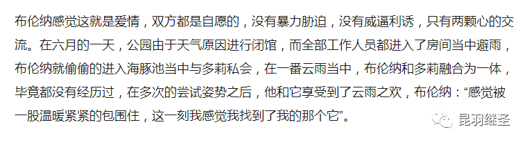 她遗憾地表示,当时进行实验时,周围都是工作人员。当发现彼得处于发情期,表现出生理欲望时,她是与实验室的其他工作人员一起处理的,将彼得与另外两只雌性海豚放在了一起,怎么就变成了人兽不伦之恋,人兽之交呢?