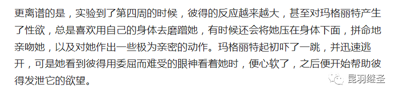 玛格丽特还说,自己是出于实验需要才与彼得朝夕相处,人非草木,跟动物相处一段时间自然是有感情的,但这种感情并不是那种喜欢,也不是“男欢女爱”的那种情爱。