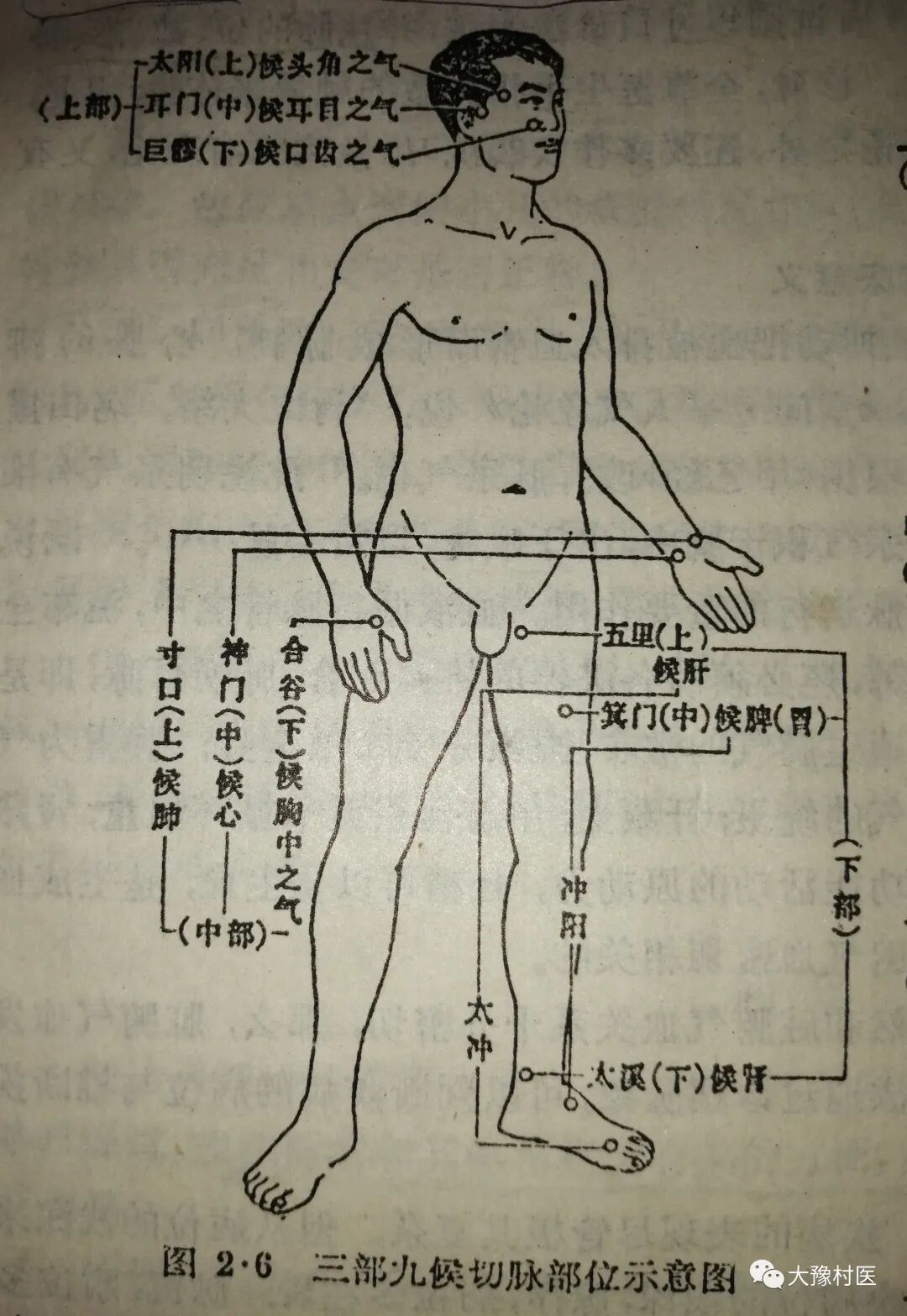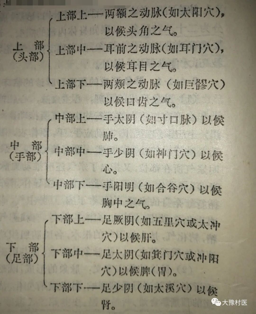 (1)遍诊法:(即《素问》三部九候法)。切脉的部位有头、手、足三部,每部又各分天地人,三而三之,合而为九,故称为三部九候法,其具体部位如下(见图)