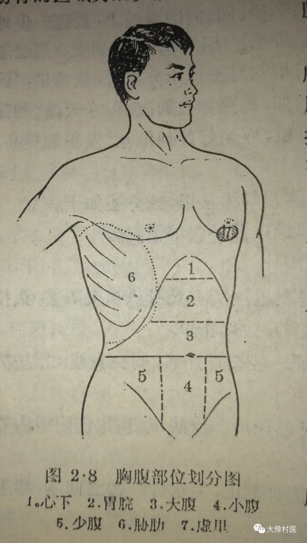 肪骨的区域为胁。腹部剑突下方位置称为心下。胃脘相当于上腹部。大腹为脐上部位,小腹在脐下,少腹即小腹之两侧。