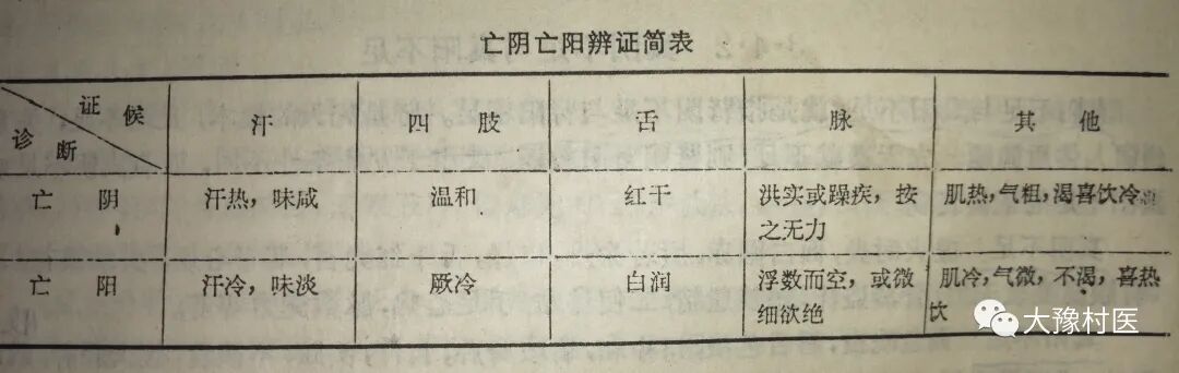兹录徐灵胎《亡阴亡阳论》,以资鉴别。徐氏说。“经云,夺血者无汗,夺汗者无血。血属阴,是汗多乃亡阴也。故止汗之法,必用凉心敛肺之药,何也?心主血,汗为心之液,故当清心火;汗必从皮毛出,肺主皮毛,故又当敛肺气。此正治也。惟汗出太甚,则阳气上竭,而肾中龙雷之火,随水而上,若以寒凉折之,其火愈炽,惟用大剂参、附,佐以咸降之品,如童便、牡蛎之类,冷饮一碗,直达下焦,引其真阳下降,则龙雷之火反乎其位而汗随止。此与亡阴之汗,真大相悬殊。故亡阴、亡阳,其治法截然,而机转在顷刻。当阳气之未动也,以阴药止汗,及阳气之既动也,以阳药止汗,而龙骨、牡蛎、黄芪、五味收涩之药,则两方皆可随宜用之。医者能于亡阴、亡阳之交,分其界限,则用药无误矣”。“其亡阴、亡阳之辨法如何?亡阴之汗,身畏热,手足温,肌热,汗亦热而味咸,口渴喜凉饮,气粗,脉沉实,此其验也;亡阳之汗,身反恶寒,手足冷,肌冷,汗冷而味淡微粘,口不渴而喜热饮,气微,脉浮数而空,此其验也。”总的来说,阴阳消长是相对的。亡阴者,因阴虚则阳亢,表现一系列热象,但究属虚证故脉虽似洪实而躁疾,必按之无力;亡阳者,因阳衰则寒,表现一系列寒证,以虚阳外越,故脉见浮数而空,甚则微细欲绝。且亡阴之际,舌红而干;亡阳之顷,舌白而润。这也是诊断时应当掌握的。