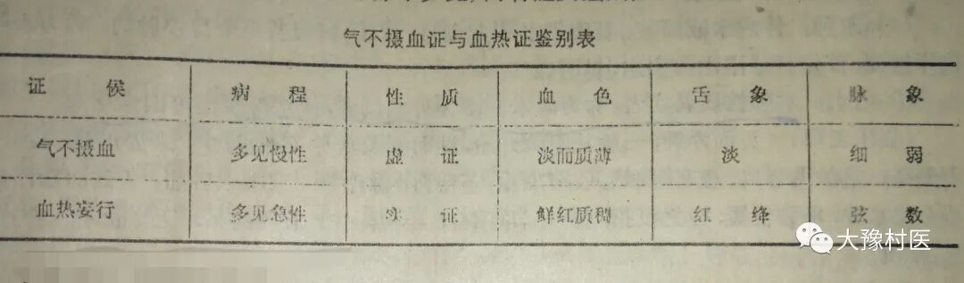 3.4、气不摄血证 气不摄血证,是气虚不能统摄血液而见失血的证候。多由久病气虚,或慢性失血,气随血耗,转而气虚不能摄血所致。 临床表现:吐血,便血,皮下瘀斑,崩漏,气短,倦怠乏力,面色白而无华,舌淡,脉细弱等。 证候分析:气不摄血证,以出血和气虚证共见为辨证要点。血液能循行脉内而不溢干脉外,全赖气的统摄作用,如气虚统摄无权,血即离经而外溢;溢于胃肠,便为吐血、溢于肌肤,则见皮下瘀斑。脾虚统摄无权,冲任不固,渐成月经过多或崩漏。气虚则气短、倦怠乏力,血虚则面白无华。舌淡,脉细弱,皆为气血不足之证。出血疾患,热证占多,气不摄血,亦不少见,两者主要鉴别如下表