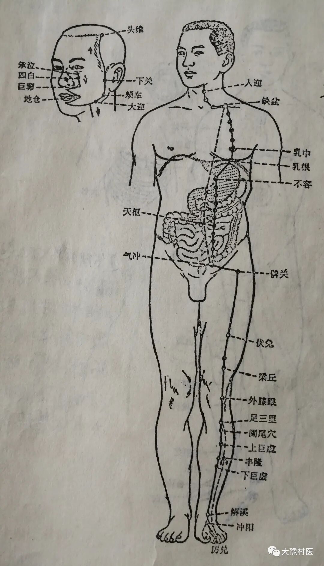 分支:从大迎穴前方下行到人迎穴,沿喉咙向下后行至大椎,折向前行,入缺盆,深入体腔,下行穿过膈肌,属胃,络脾。 直行者:从缺盆出体表,沿乳中线下行,挟脐两旁(旁开二寸),下行至腹股沟处的气穴。分支:从胃下口幽门处分出,沿腹腔内下行到气街穴,与直行之脉会合,而后下行大腿前侧,至膝膑,沿下肢胫骨前缘下行至足背,入足第二趾外侧端(厉兑穴)。分支:从膝下三寸处(足三里穴)分出,下行入中趾外侧端。分支:从足背上冲阳穴分出,前行入足大趾内侧端(隐白穴),交于足太阴脾经。