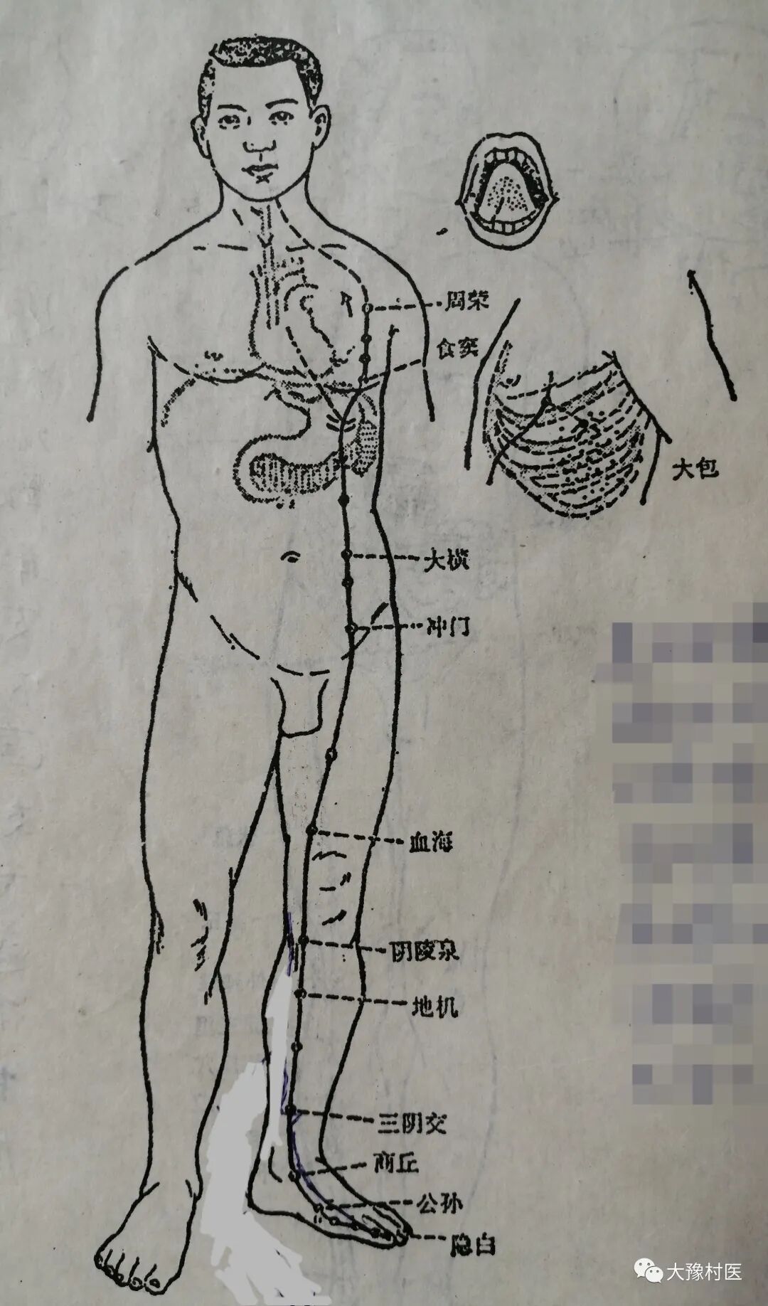 足太阴脾经起于足大趾内侧端(隐白穴),沿内侧赤白肉际,上行过内踝的前缘,沿小腿内侧正中线上行,在内踝上八寸处,交出足厥阴肝经之前,上行沿大腿内侧前缘,进入腹部,属脾,络胃。向上穿过膈肌,沿食道两旁,连舌本,散舌下。