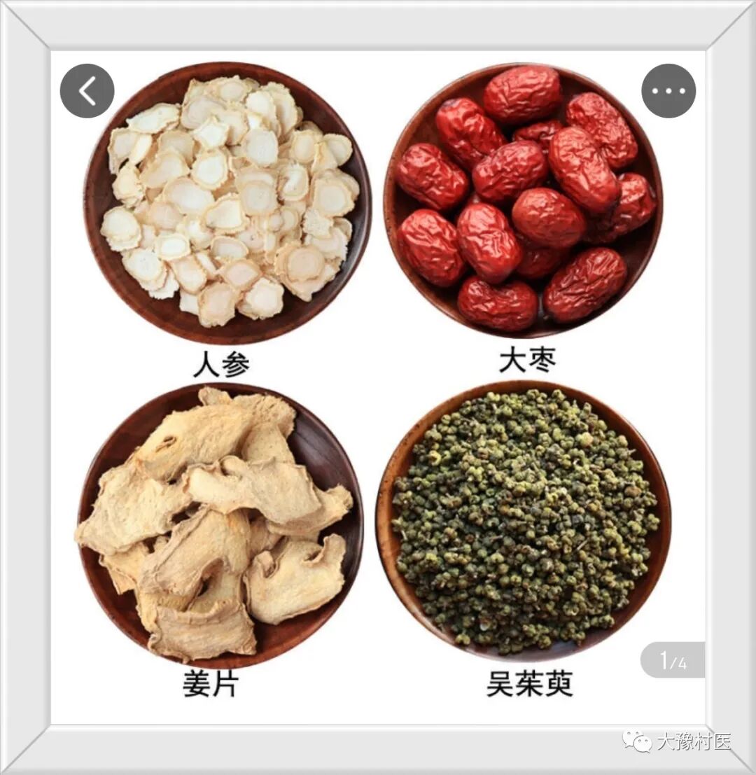 组成:吴茱萸一升,汤洗(3g) 人参三两(6g) 大枣十二枚,擘(四枚) 生姜切,六两(18g)