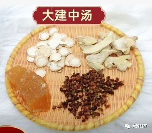 方解: 阳虚则阴盛,阴盛则寒生,阴寒之气上逆,则心胸中大寒痛,呕不能饮食,甚则可上冲皮起如有形,上下攻冲而剧痛,手不可触近。若内有寒饮僻积,则肠中漉漉有声。此时急当温中补虚,祛寒降逆,方可痛止呕平。所以本方用味辛性热,温脾胃,助命火,散寒除湿,下气散结之蜀椒为君药。干姜温中散寒,助蜀椒建中阳,散逆气,止痛平呕,为臣药。人参、胶饴,甘温补中而益脾胃,并为佐使。如此配合,虽已对病,但邪甚势急,服药须及时,故方后注明,初服后“如一炊顷”,或“如饮粥二升”,便当“更服”,使药力相继,一鼓成功。然而病虽去,胃气未必便复,所以“当一日食糜粥”,将养胃气,亦为《素问·脏气法时论》中“毒药攻邪,五谷为养”之意。同时,还考虑到阳气素虚,易感风寒,所以“温覆之”,免外寒入里而复发。其用心如此周密,不仅遣药组方非常审慎细致,即“分温再服”间相隔时间的多少,以及服后应如何将护,也无不交代清楚。 本方纯用辛甘之品温建中阳,其补虚散寒之力,远较小建中汤为峻,故名大建中汤。小建中汤则以辛甘为主,佐以大量芍药,又有酸甘合化为阴之义,故宜于中阳虚而营阴亦有不足之证。此大、小建中二方同中之异。方论 :汪昂:“此足太阴、阳明药也。蜀椒辛热,入肺散寒,入脾暖胃,入肾命补火。干姜辛热,通心助阳,逐冷散逆。人参甘温,大补脾肺之气。饴糖甘能补土,缓可和中。盖人之一身,以中气为主,用辛辣甘热之药,温建其中脏,以大去下焦之阴,而复其上焦之阳也。”《医方集解》