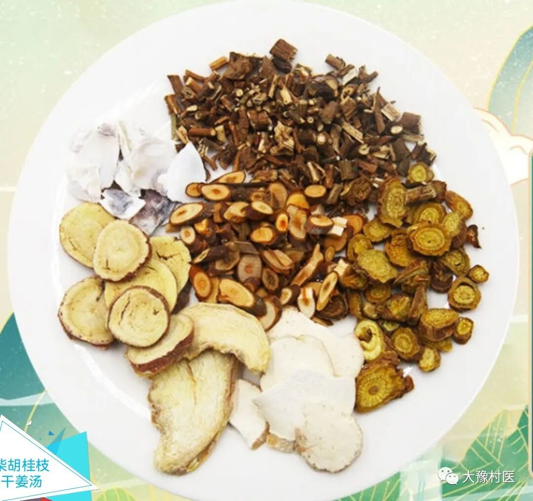 附方:柴胡桂枝干姜汤《伤寒论》柴胡半斤(15g)桂枝去皮,三两(12g)干姜二两(6g)栝楼根四两(12g)黄芩三两(9g)牡蛎熬,二两(20g)甘草炙,二两(8g)上七味,以水一斗二升,煮取六升,去滓,再煎取三升,温服一升,日三服。初服微烦,复服,汗出便愈。功用:和解散结,温里祛寒。主治:伤寒胸胁满微结。小便不利,渴而不呕,但头汗出,往来寒热,心烦。亦治疟疾寒多微有热,或但寒不热。 本方系小柴胡汤化裁而成。方中柴胡、黄芩和解少阳,栝楼根生津止渴,牡蛎化痰开结,桂枝、干姜温散里寒,甘草调和诸药,合而成为和解散结、温里祛寒之方。方论:汪昂:“此阳明表里通用之剂也。麻黄、桂枝所以解表散寒,甘草、芍药所以和中止痛,苍术、厚朴平胃土而祛湿,陈皮、半夏行逆气而除痰,芎、归、姜、芷入血分而祛寒湿,枳壳、桔梗利胸膈而清寒热,茯苓泻热利水,宁心益脾,所以为解表温中除湿之剂,去痰消痞调经之方也。一方统治多病,惟活法者变而通之。”《医方集解》