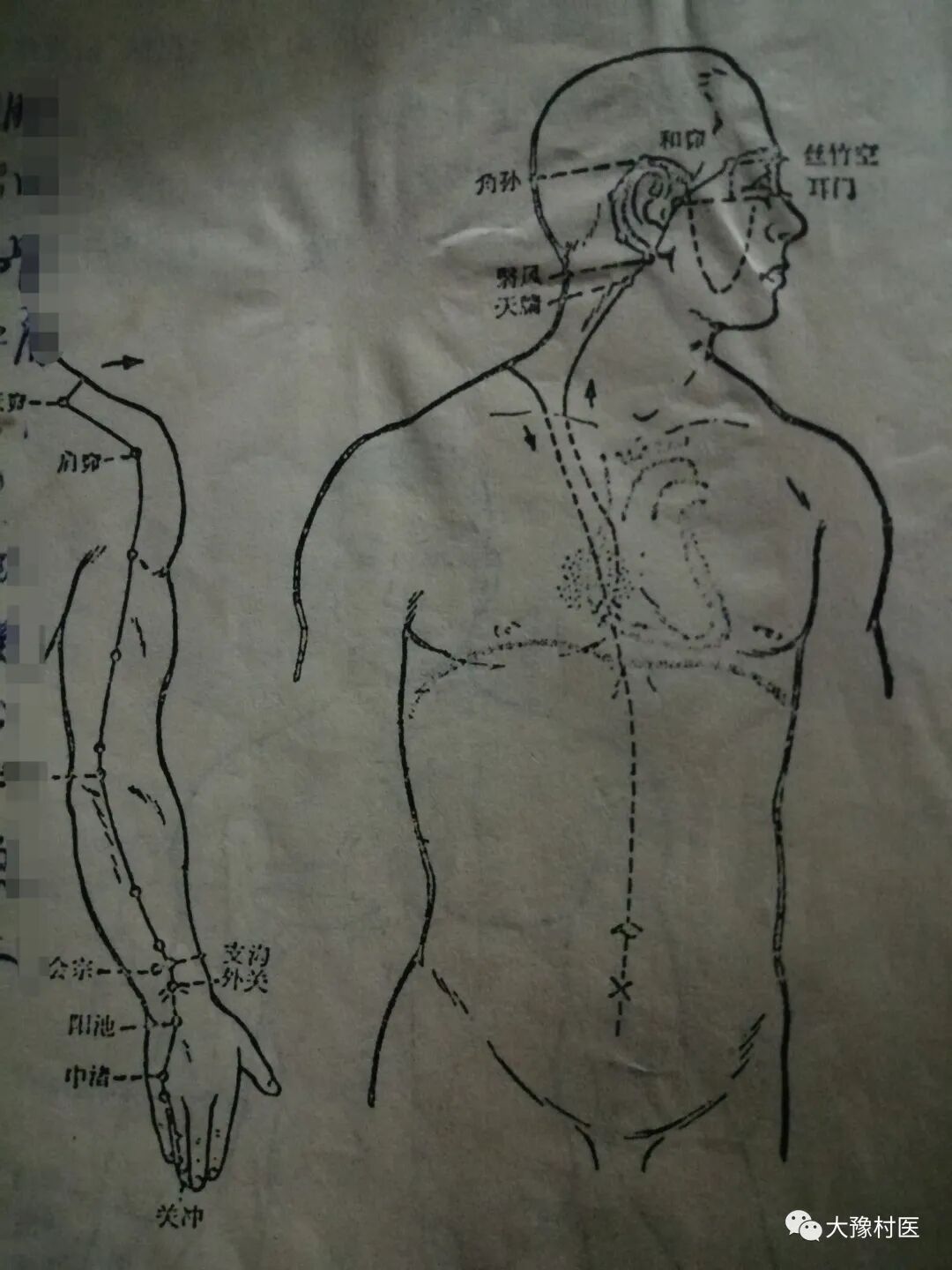 分支:从膻中分出,上行出缺盆,至肩部,左右交会于大椎,上行到项,沿耳后(翳风穴)直上出耳上角,然后属曲向下经面颊部至目眶下。