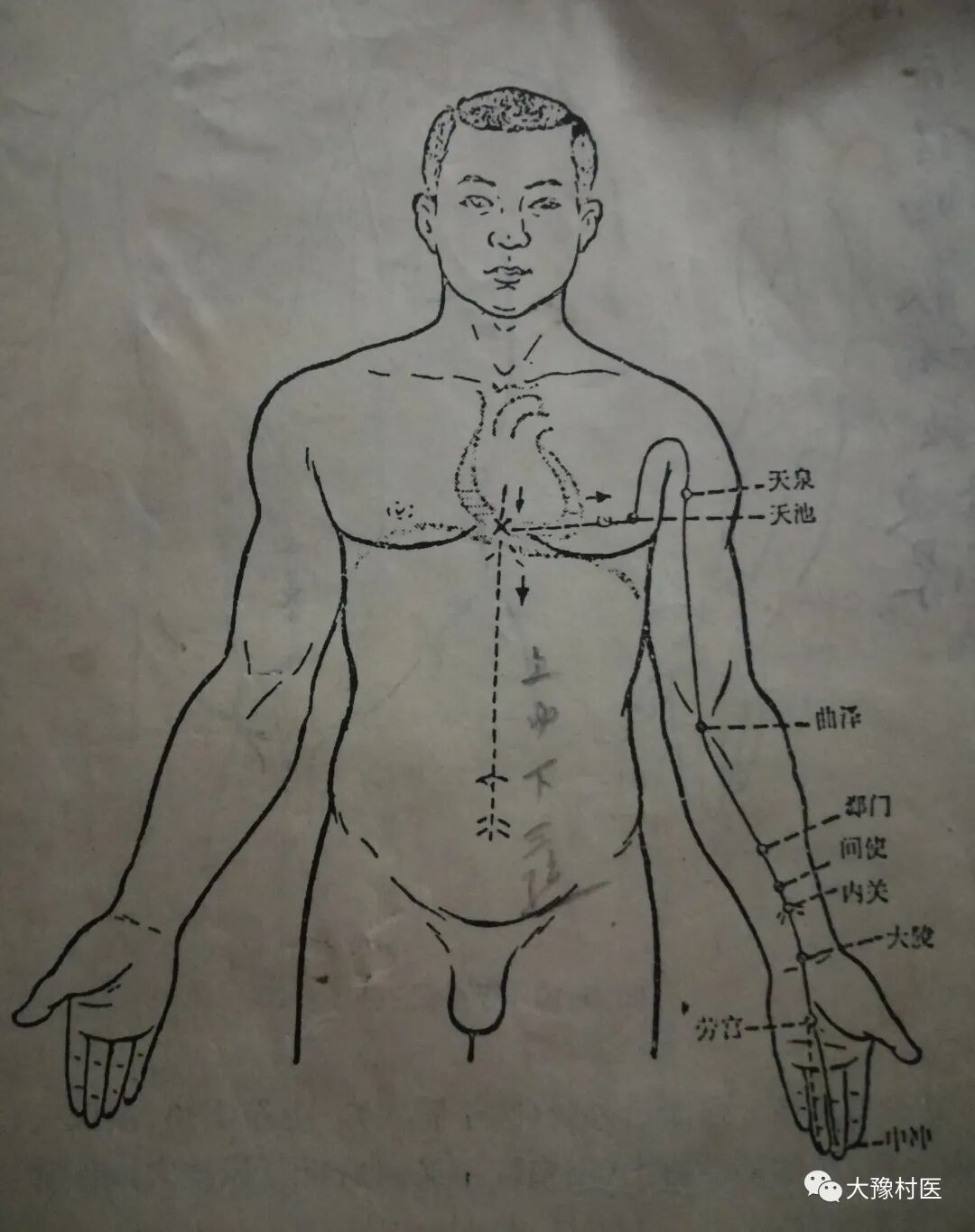 分支:从胸中分出,沿胸浅出胁部当腋下三寸处(天池穴),向上至腋窝下,沿上肢内侧中线入肘,过腕部,入掌中(劳宫穴),沿中指桡侧,出中指桡侧端(中冲穴)。