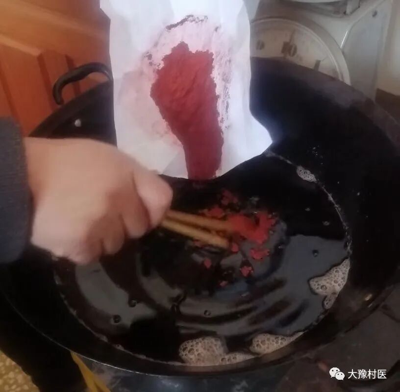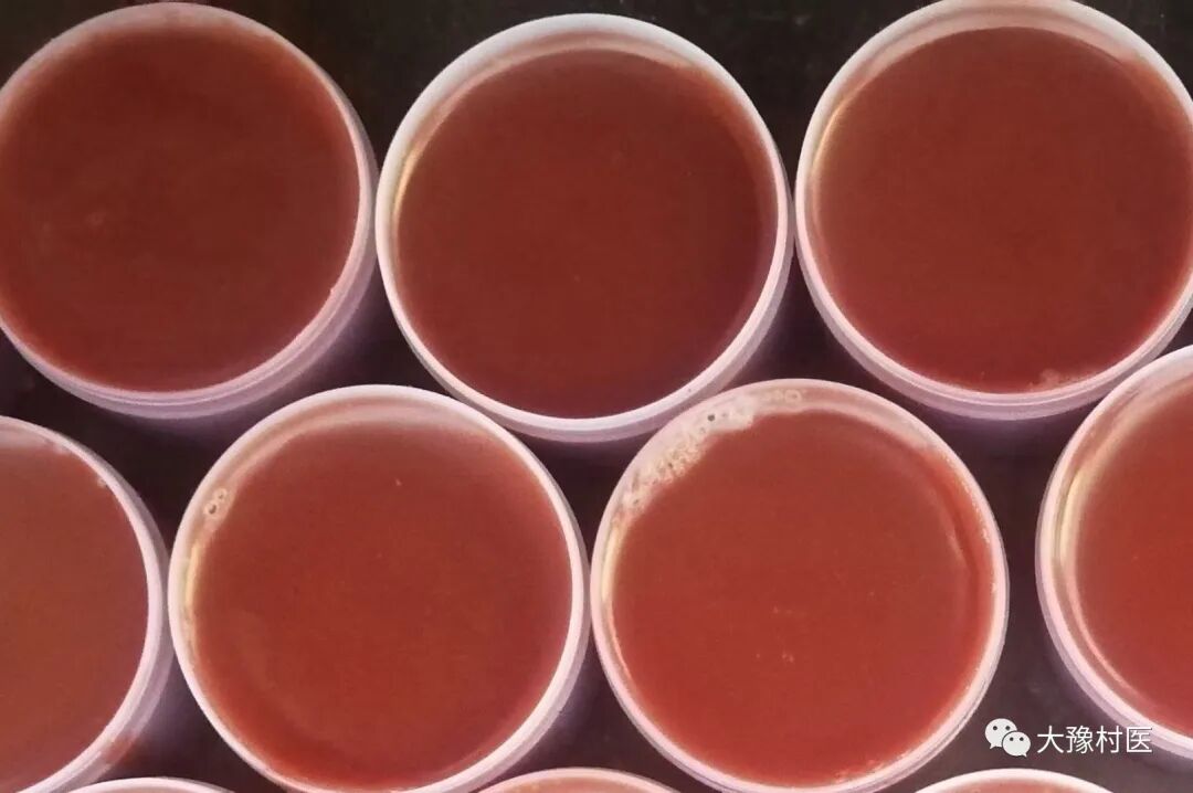 制备:将血竭、轻粉单研极细粉,白芷、甘草、当归、紫草放入盛麻油的炒锅内浸泡1周,然后放小火上熬开,待几味中药焦枯欲黑前退火,过细铁筛去药滓,放入蜂蜡溶化,待油温下降至40度左右兑入血竭和轻粉,挍拌至药凉欲凝时倒入分药盒盛器中。