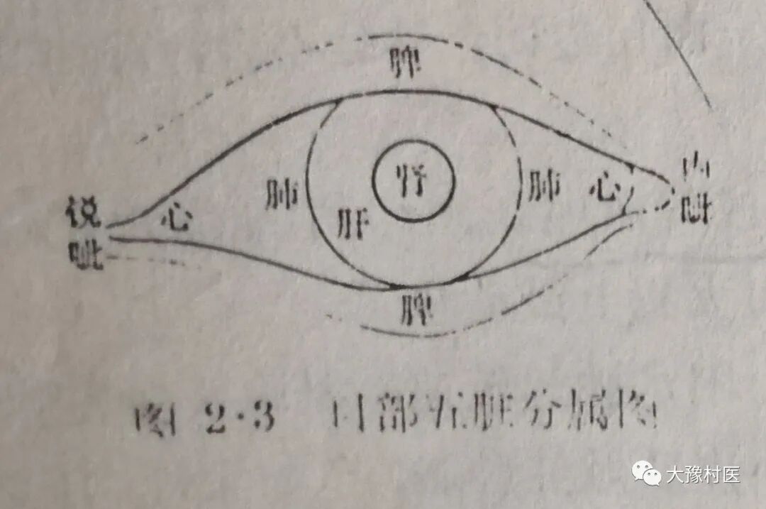 (1)、目部的脏腑相关部位:《灵化·大惑论》 :“精之窠为眼,骨之精为瞳子,筋之精为黑眼,血之精为络,其窠之精为白眼,肌肉之精为约束,……”后世医家据此发展成为“五轮”学说,以目部不同部位的形色变化,诊察相应脏腑的病变、目部的脏腑相关部位是:内眥及外眥的血络属心,称为“血轮”;因为心主血,而血之精为络,黑珠属肝,称为“风轮;因肝属风主筋,筋之精为黑晴。白珠属肺,称为“气轮”;因肺主气,气之精为白睛,瞳人属肾,称为“水轮”;因肾属水,主骨生髓,骨之精为“瞳人”;眼胞属脾,称为“肉轮”;因脾主肌肉,肌肉之精为约束(眼睑)。