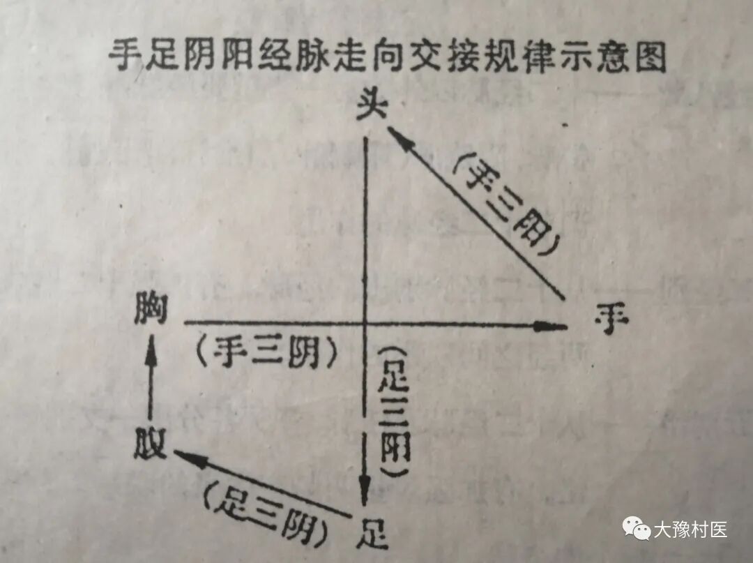 (2)、走向、交接、分布、表里关系及流注次序 (2.1 )、走向和交接规律 十二经脉的走向和交接是有一定规律的。《灵枢·逆顺肥瘦》篇说“手之三阴,从脏走手;手之三阳,从手走头;足之三阳,从头走足;足之三阴,从足走腹。”即:手三阴经从胸腔走向手指末端,交手三阳经;手三阳经从手指末端走向头面部,交足三阳经;足三阳经从头面部走向足趾末端,交足三阴经。足三阴经从足趾走向腹腔、胸腔,交手三阴经(见下图)这样就构成一个“阴阳相贯,如环无端”(《灵枢·营卫生会》)的循环径路。