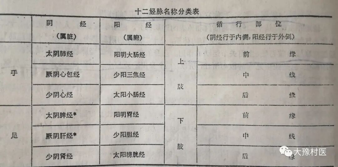 (1)、名称 十二经脉对称地分布于人体的两侧,分别循行于上肢或下肢的内侧或外侧:每一经脉分别属于一个脏或一个腑,因此,十二经脉中每一经脉的名称,包括手或足、阴或阳、脏或腑三个部分。手经行于上肢,足经行于下肢;阴经行于四肢内侧,属脏,经行于四肢外侧,属腑。(见下表)
