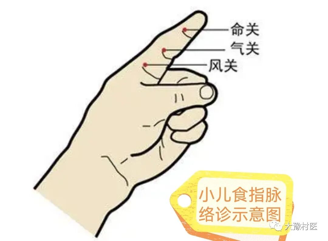 (2)诊络脉手法:抱小儿向光,医师用左手握小儿食指,以右手大拇指用力适中从命关向气关、风关直推,推数次,络脉食推愈明显,便于观察。