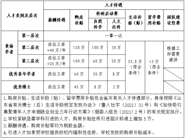 (1)人才引进政策:《烟台大学人才引进与管理实施办法》