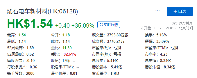 烯石电车新材料(06128.HK),前称泛亚国际,于2014年6月25日在香港上市;于2021年5月4日更改股份名称。截至昨日(8月17日)收市,其收报 1.54港元,总市值为8.34亿港元。