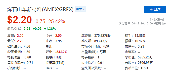 截至首日(8月17日)收市,烯石电车新材料每股收报2.20美元,目前其总市值约 5,955.25万美元。