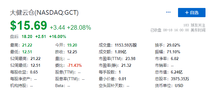 截至首日(8月18日)收市,大健云仓每股收报15.69美元,较IPO发行价涨28.08%,目前其总市值约 6.24亿美元。