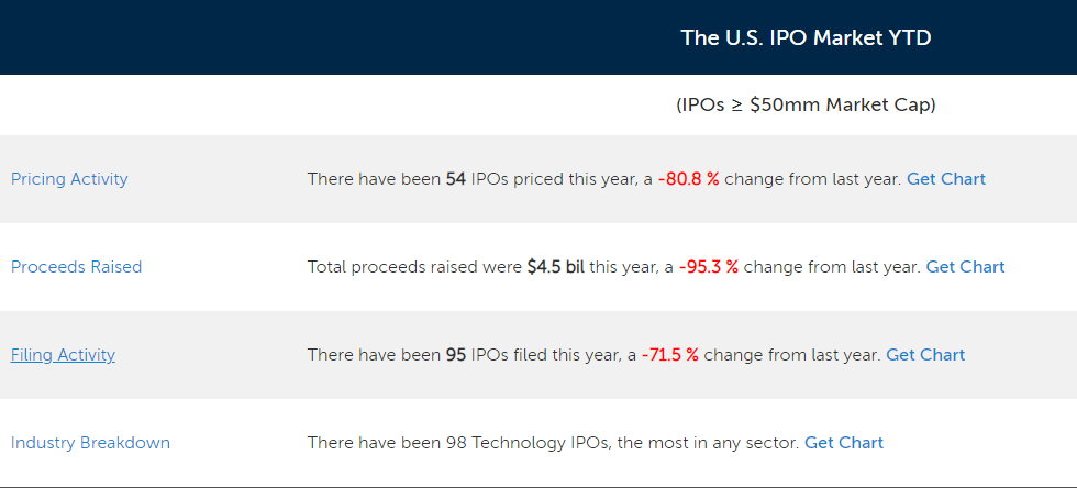 上一次出现如此低的IPO募资规模还要追溯到2009年,当时美国正在从金融危机的深渊中复苏,IPO市场在当年年底前重新开放。
