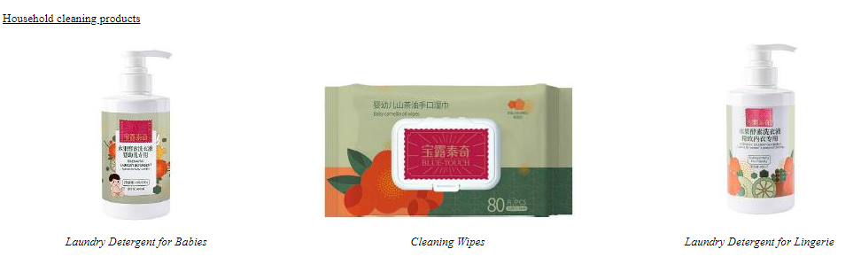 宝露泰奇,目前的产品组合包括两大类产品,包括婴儿护肤品和洗浴用品、以及家居清洁产品。在婴儿护肤品和洗护用品方面,代表产品包括山茶油、山茶油保湿霜、山茶油乳液、山茶油二合一洗发水和沐浴露;家居清洁产品方面,主打产品包括衣物柔顺剂、洗衣液、多功能清洁剂和消毒剂。