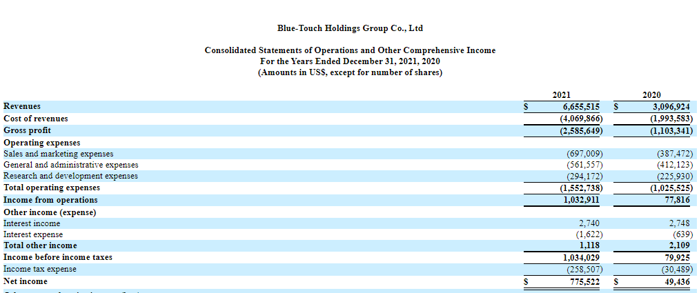招股书显示,在过去的2020年、2021年两个财政年度,宝露泰奇的收入分别为309.69万、665.55万美元,相应的净利润分别为4.9万、77.55万美元。