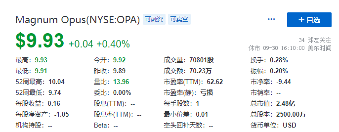 截至上周五(9月30日),SPAC公司Magnum Opus 的市值为2.48亿美元。