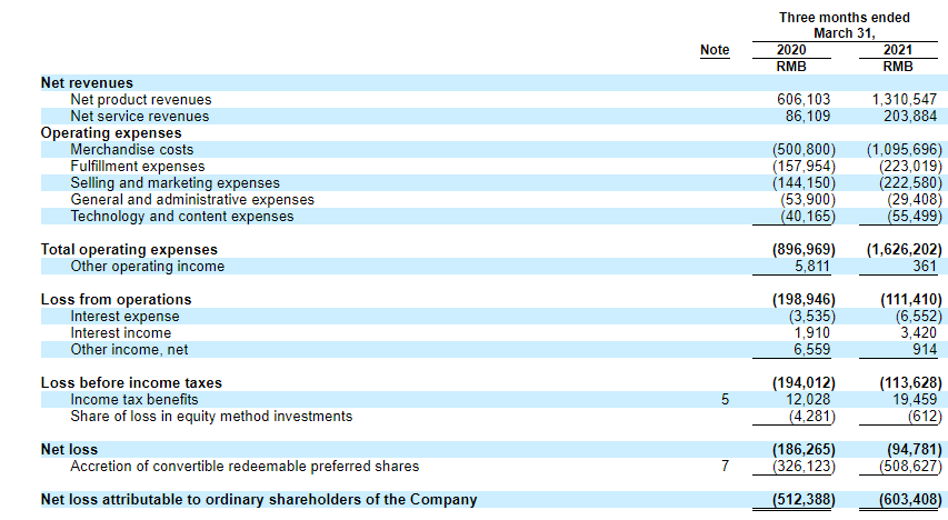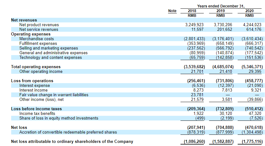 招股书显示,在过去的2018、2019年、2020年和2021年第一季度,万物新生的收入分别为32.62亿、39.32亿、48.58亿和15.14亿元人民币,相应的净亏损分别为 10.86亿、15.83亿、17.75亿和6.03亿元人民币。
