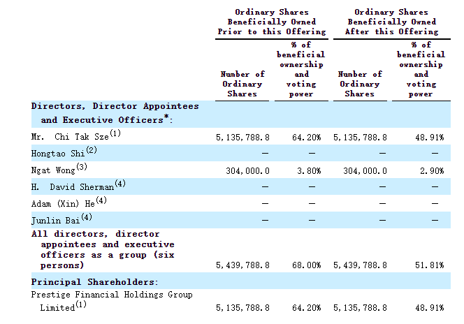 Mr. Chi Tak Sze,通过Prestige Financial Holdings Group Limited持有48.91%;