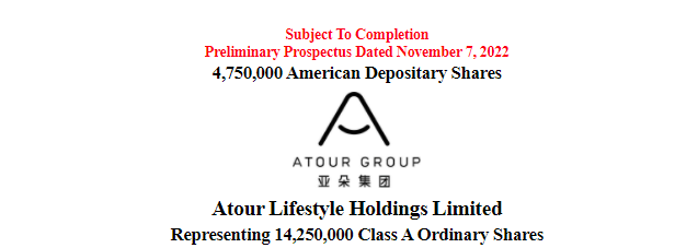 2022年11月7日,来自上海的亚朵酒店的实质控股公司Atour Lifestyle Holdings Limited,在美国证监会(SEC)提交更新后的招股书,拟在美国纳斯达克上市,股票代码为“ATAT”,计划发行475万份ADS,每份ADS代表3股普通股。每份ADS发行价介乎11美元至13美元,最多募资6175万美元。