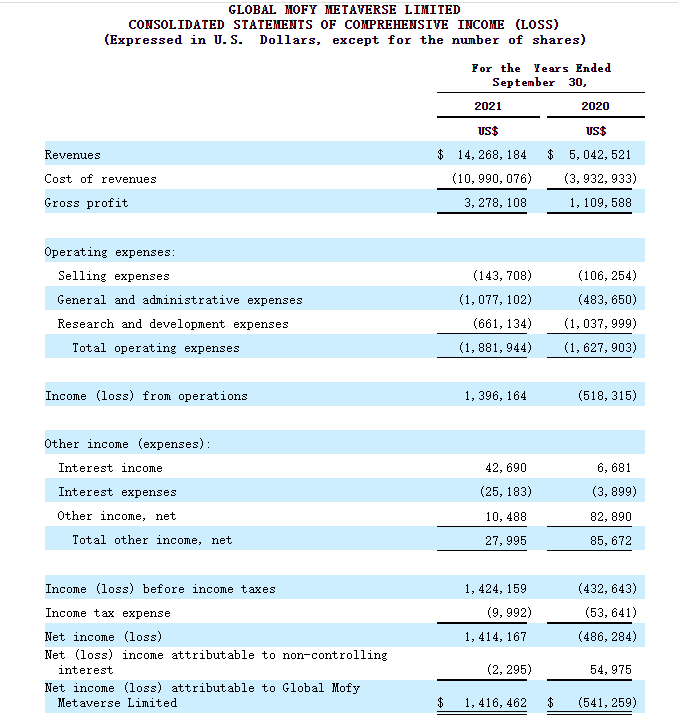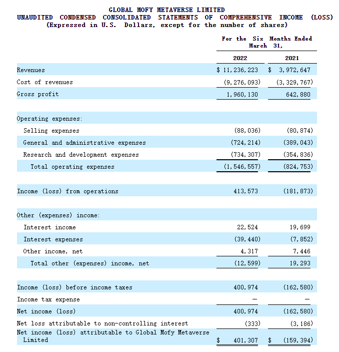 招股书显示,在过去的2020年、2021年两个财年(财年结算日期为9月30日)和2022财年前六个月(截至2022年3月31日),环球墨非的收入分别为504.25万、1,426.82万和1,123.62万美元,相应的净利润分别为-54.13万、141.65万和40.13万美元。