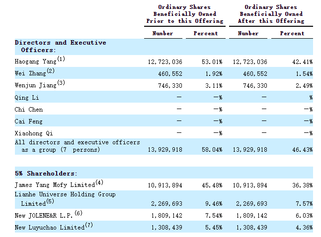 杨好刚,通过James Yang Mofy Limited直接持股45.48%、通过New JOLENE&R L.P间接控制7.54%,合计控制53.01%;