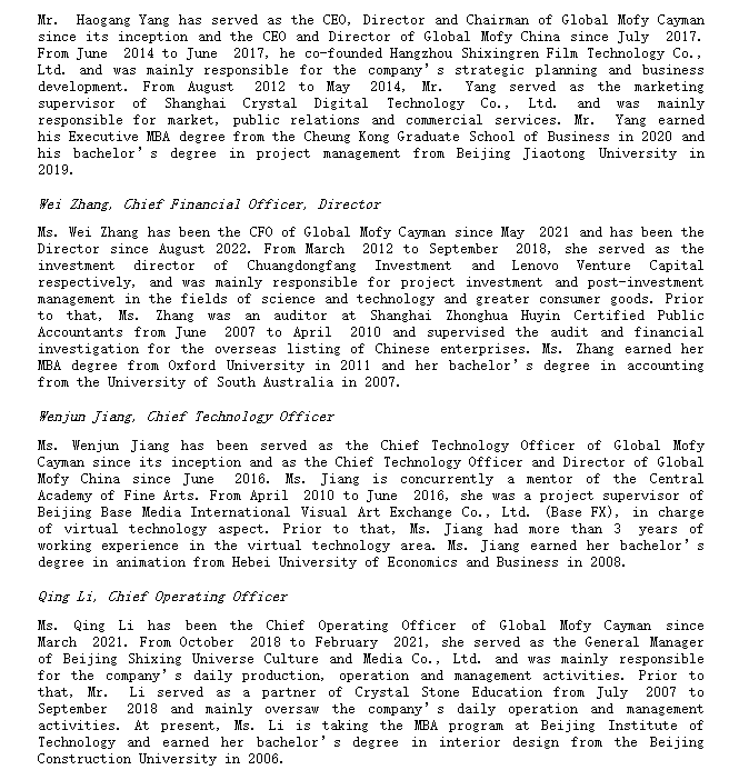 环球墨非,成立于2017年11月,总部位于北京,作为一家从事元宇宙行业虚拟内容制作、数字营销和数字资产开发的技术解决方案提供商,主要通过公司专有的“Mofy Lab”技术平台(该平台由尖端的三维(“3D”)重建技术和人工智能(“AI”)交互技术组成),创建广泛的3D高清虚拟版本可以在不同应用中使用的物理世界对象(如人、动物和场景)。