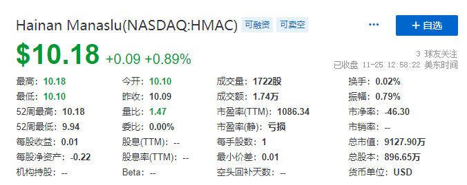 截至周五(11月25日),SPAC公司Hainan Manaslu(HMAC)的市值约9,127.90万美元。