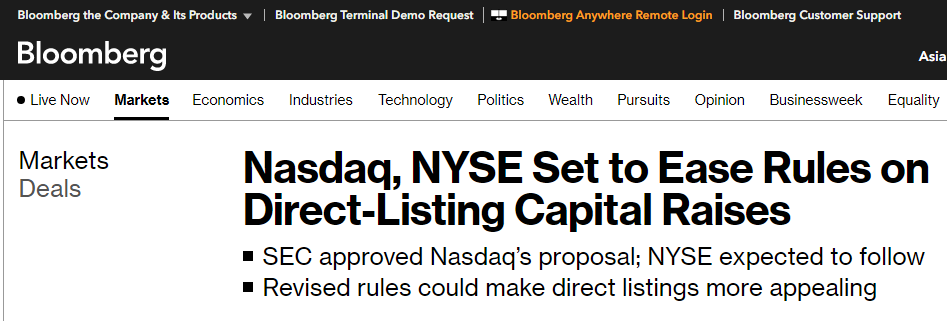 据彭博社报道,纳斯达克公司获准可以放宽直接上市的资本筹集限制,以鼓励更多公司利用直接上市方式上市,纽约证券交易所也将很快跟进。