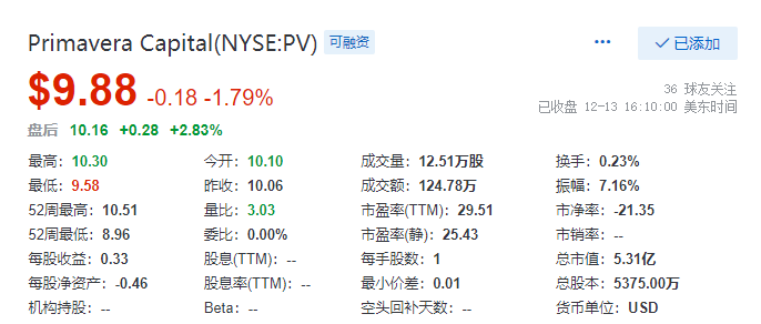 截至昨日(12月13日)收市,Primavera Capital(PCAC)市值为5.31亿美元。
