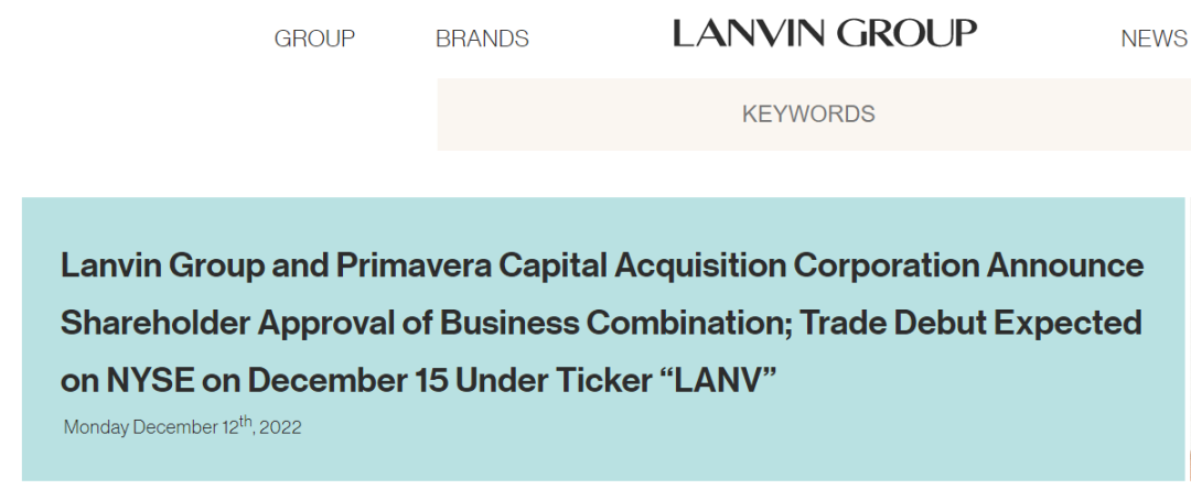复星国际(00656.HK)旗下的全球时尚奢侈品集团Lanvin Group 复朗集团(简称“复朗集团”)与SPAC(特殊目的现金公司)Primavera Capital Acquisition Corp.(PCAC)的合并已获股东大会批准,预计将于12月15日在纽交所挂牌上市,股票代码为「LANV」。