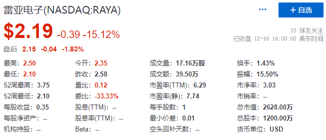 截至昨日(12月16日)收市,雷亚电子收报2.19美元,较IPO发行价下跌45.25%,目前其总市值2628万美元。