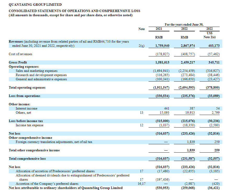 招股书显示,在过去的2021财年、2022财年(财年截至日期为每年6月30日)和2023财年的前三个月,量子之歌的收入分别为17.60亿、28.68亿和6.59亿元人民币,相应的净亏损分别为3.16亿、2.33亿和0.97亿元人民币。