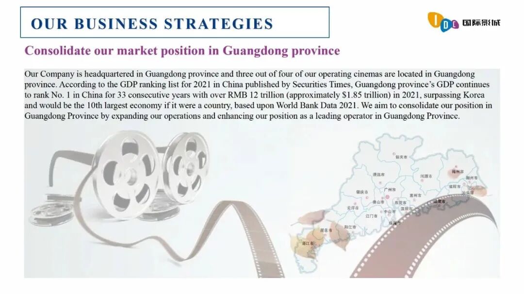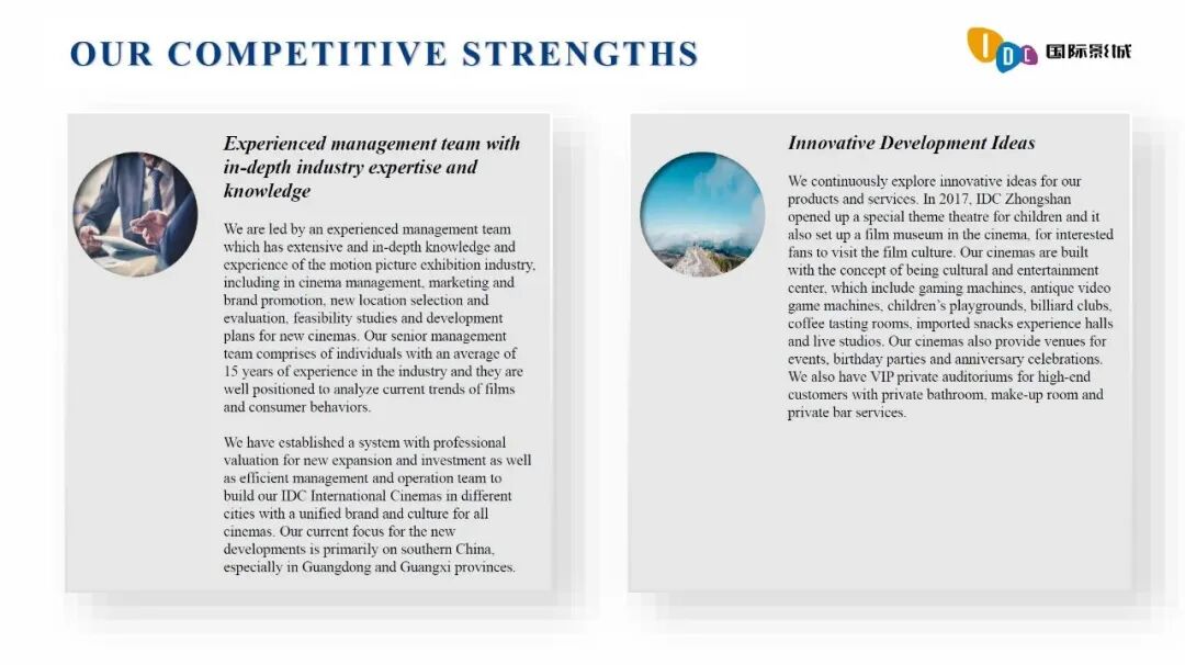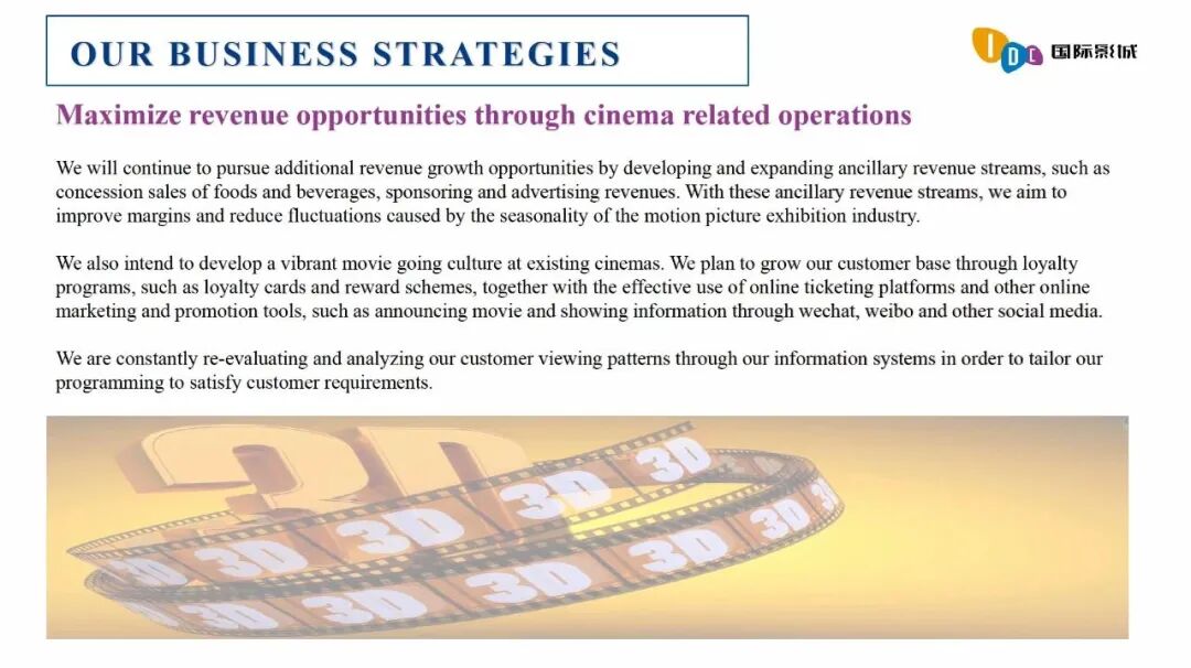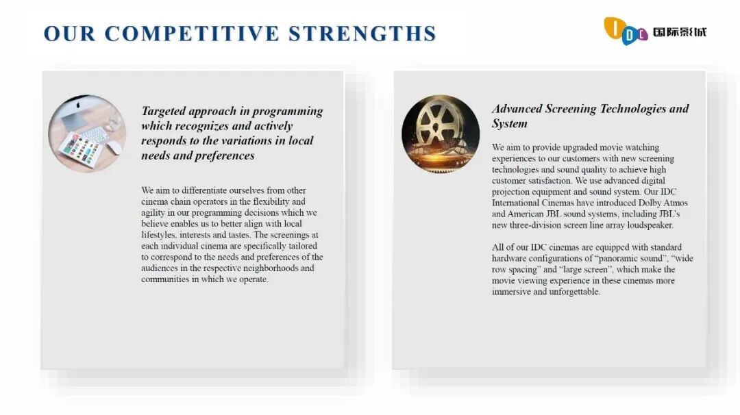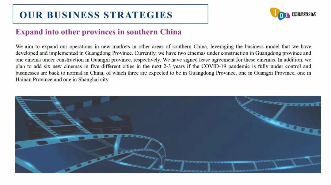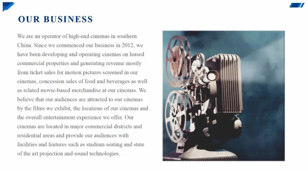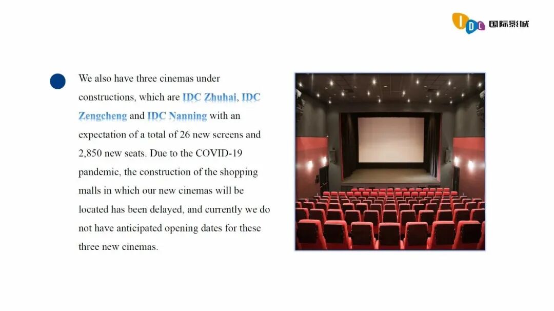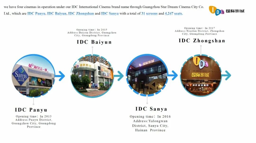 影高文化,作为华南地区高端影院的运营商,主要业务是开发、运营电影院,并主要通过在电影院放映的电影的门票销售、食品和饮料的特许销售以及在相关电影商品中获得收入。影高文化通过广州星梦电影城有限公司以IDC国际影院品牌运营4家影院,分别是IDC番禺、IDC白云、IDC中山、IDC三亚,共有31块银幕和4,247个座位。公司还有3家正在建设中的电影院,分别是IDC珠海、IDC增城、IDC南宁,预计将新增26块银幕和2850个新座位。
